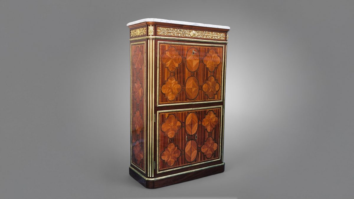 Chef-d’œuvre de l’ébénisterie française, ce secrétaire Louis XVI estampillé Leleu a bénéficié d’une restauration respectueuse de son histoire. La marqueterie, signature du style Louis XVI, a été restaurée selon les techniques d’époque. L’intervention préserve le raffinement des motifs et la délicatesse des assemblages caractéristiques du travail de Leleu, maître ébéniste reconnu pour la finesse de ses créations.